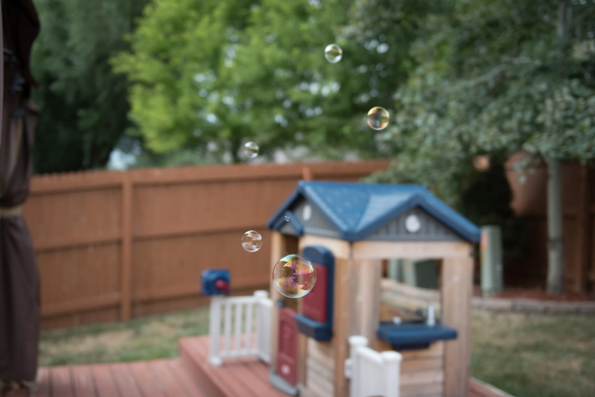 Ohmer House: Backyard. I know all kids love bubbles. And I get it. Bubbles are awesome. They float, they're shiny, they pop and they are seemingly created out of thin air. Mia's love for bubbles goes beyond that of a typical child. The excitement that uncontrollably flies from every extremity of her body. Her arms flap (crooked at the elbow while her forearms to most of the flapping), her legs stomp and the loud gasp "heee" that follows. Pure happiness comes in a 99 cent bottle. In her various forms of therapy, we often use bubbles as a reward.