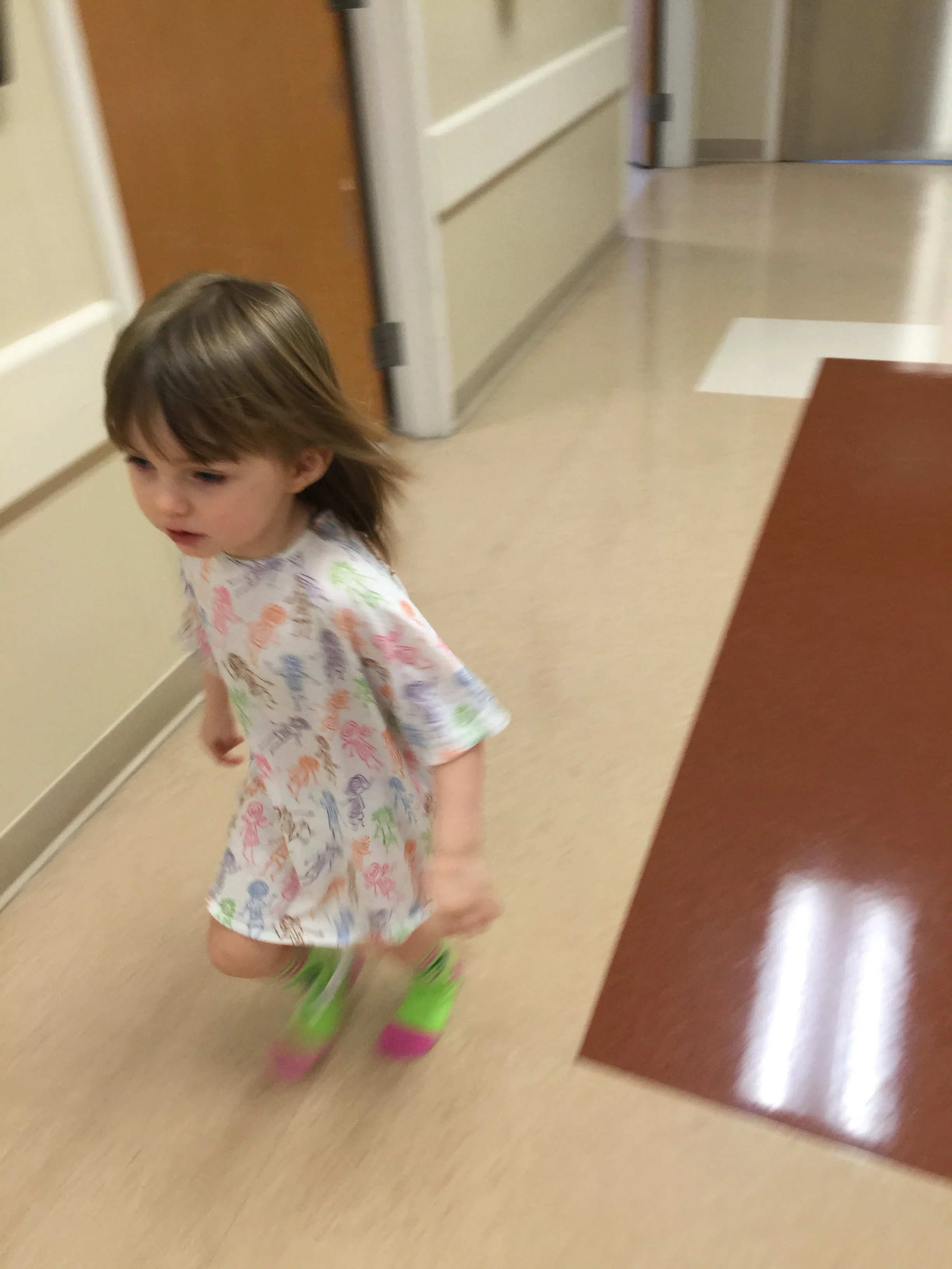 Her surgey took about 45 minutes. The nurse came to get us around 9. She told me she was still coming out of the anesthesia and it was normal for kids to act "crazy". We walked into the recovery area and I found Mia curled up in a ball on her bed crying. She was digging her forehead into the pillow. The nurse asked me to pick her up and sit with her in the chair. I held Mia as she thrashed in my arms. Unable to open her eyes she screamed and flung her body. Her IV was still in her hand and I was worried she would pull it out. CJ held an oxygen tube in front of her nose trying to coax her into consciousness.