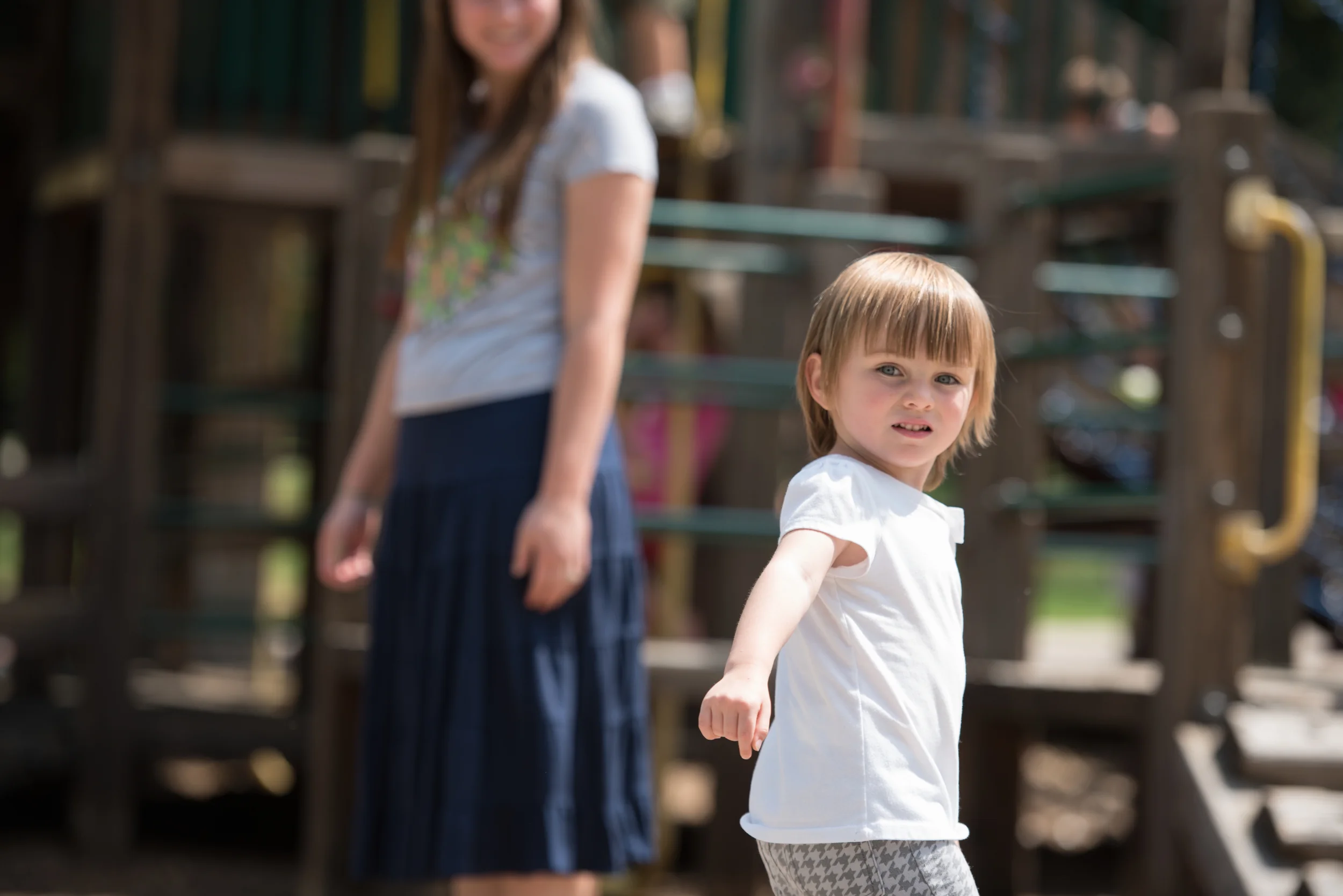 Mia makes a b-line for the ramp that leads into the first floor. The area is completely shaded by the wood slats above. She runs down the passageway, makes a right across the bridge, takes a left down the steps, runs a full sprint across the wood chipped ground and then ascends a diagonal ladder (the ladder is angled 25 degrees to make it accessible for toddlers). She peeks into the green metal tunnel that is elevated to her mid chest and then turns left to cross the bridge again. When I see her cross the bridge for the second time, I know she has established her circuit for the day. I dont want to hyperbolize, but EVERY time we go to a playground, Mia finds a route to run and does it over and over and over again.