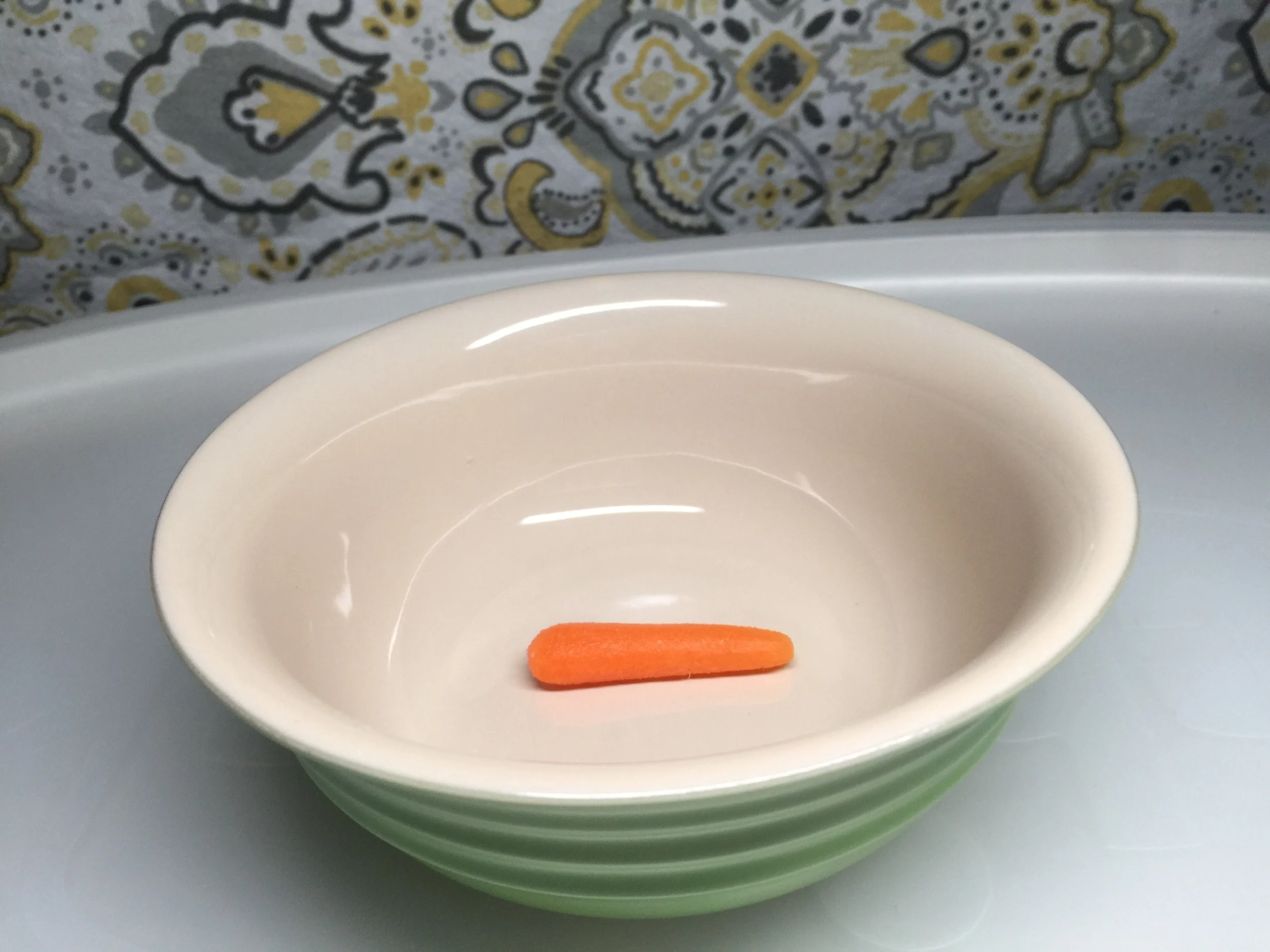 "Good job Mia, now can you kiss the carrot?" Liz said as she kissed her own mini carrot. Mia puckered her lips and smacked the broad side of the carrot. "Good job Mia, you kissed it" Liz said. Another goldfish plunked in her bowl. "Now can you lick it Mia? Can you lick the carrot?" Mia made a face like she smelled a rat. She didn't do it right away, as if she sensed the carrot had some beneficial nutritional value. "Come on Mia, can you lick it?" Mia picked it up and with a mildly disgusted look she licked the carrot. "Good job!" Liz said.