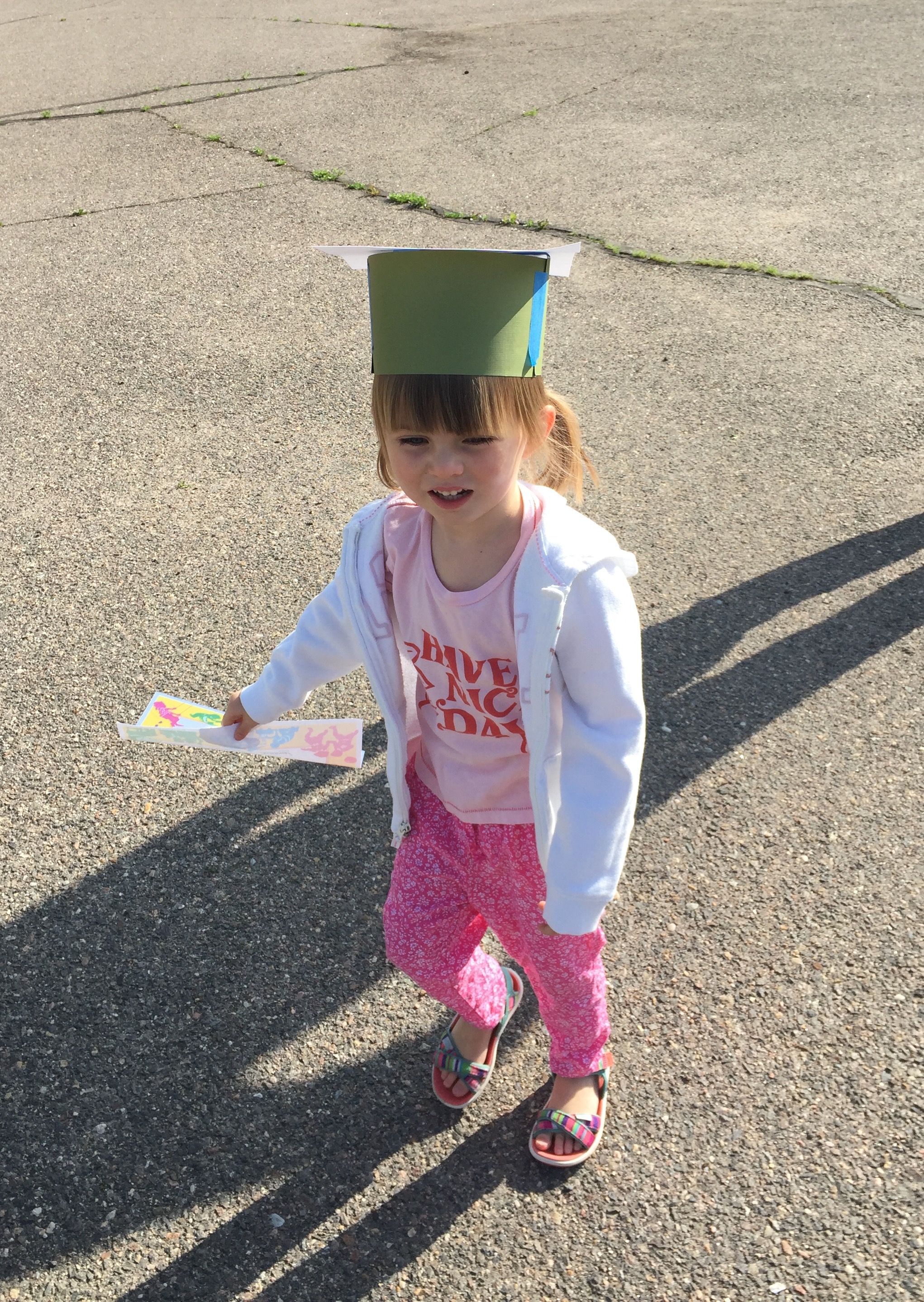 Just a few minutes after 8 the kids start filing out. Mia is probably the fifteenth in line. All the kids are wearing homemade mortar boards that read "2016 Grads" on the top. It's a very cute ceremony, I wish I was enjoying it more. Mia's OT Rosemary is walking with her hand in hand. A feeling of relief came over me. "She's doing good" I thought to myself. I take my phone out of my purse and swipe the camera icon at the bottom of the screen. I hit record. All the parents are jockying for the best vantage point to take their videos while not obscuring each others view. I find myself close to the line of kids. I don't call out to Mia. I know that it's best if she doesn't see me. Despite the fact that I try to hide myself behind the bodies of the other parents, Mia catches my view.